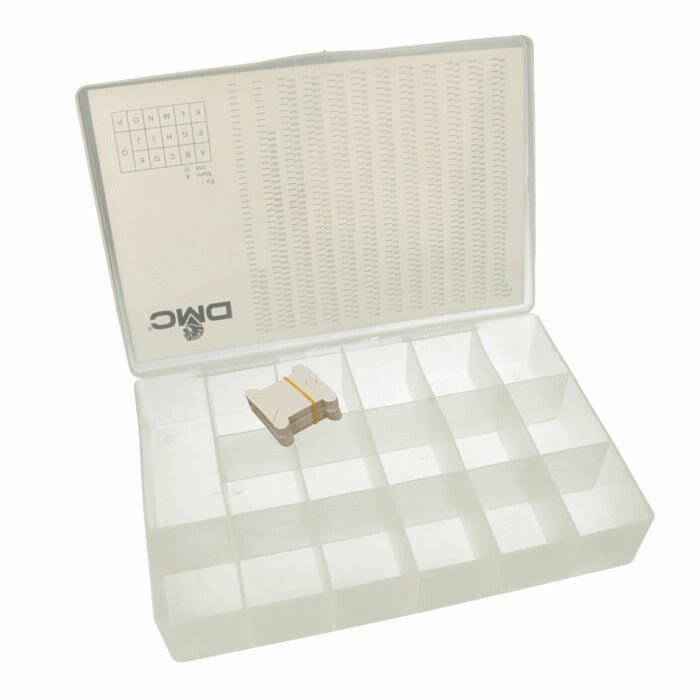 Deze doorzichtige opbergbox van DMC is geschikt voor 108 wikkelkaartjes met DMC splijtzijde. Inclusief 50 kartonnen wikkelkaartjes en een DMC kleurenlijst.