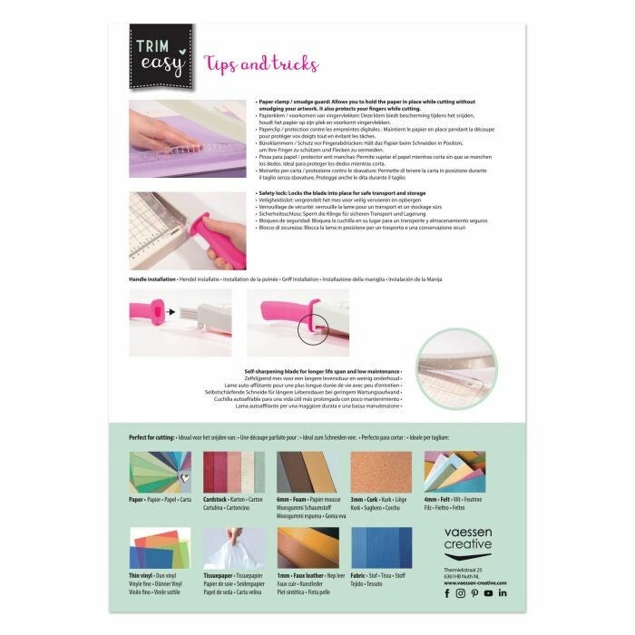 Deze guillotine snijmachine van Vaessen Creative snijdt moeiteloos door papier en karton maar ook door dun foam, kurk, vilt, leer, stof en vinyl. Er kunnen maximaal 5 vellen papier van 80 g/m² tegelijk gesneden worden.