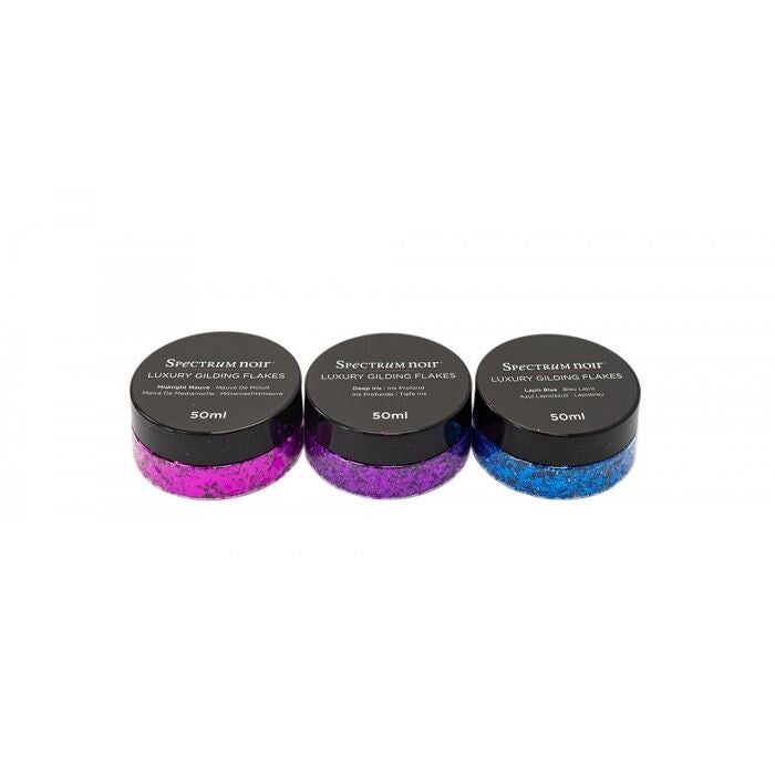 Deze set bestaat uit 3 potjes gilding flakes van 50ml in de kleuren Midnight Mauve, Deep Iris en Lapis Blue.